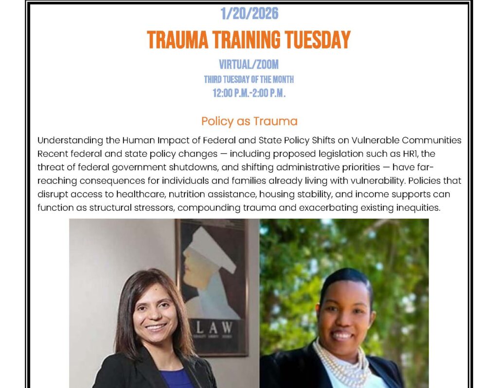 On Jan. 20, participants will gain a trauma-informed understanding of policy as a social determinant of health and well-being, with a specific focus on healthcare access and food insecurity.